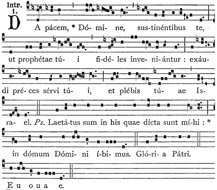 Da pacem, Dómine, sustinéntibus te, ut prophétæ tui fidéles inveniántur: exáudi preces servi tui et plebis tuæ Israël. +Salm 121, 1. Lætátus sum in his, quæ dicta sunt mihi: in domum Dómini íbimus.