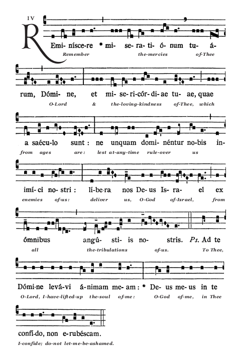 Reminíscere miseratiónum tuarum, Dómine, et misericórdiæ tuæ, quæ a sǽculo sunt : ne umquam dominéntur nobis inimíci nostri : líbera nos, Deus Israël, ex ómnibus angústiis nostris. &1-2 / Ad te, Dómine, levávi ánimam meam : Deus meus, in te confído, non erubéscam.