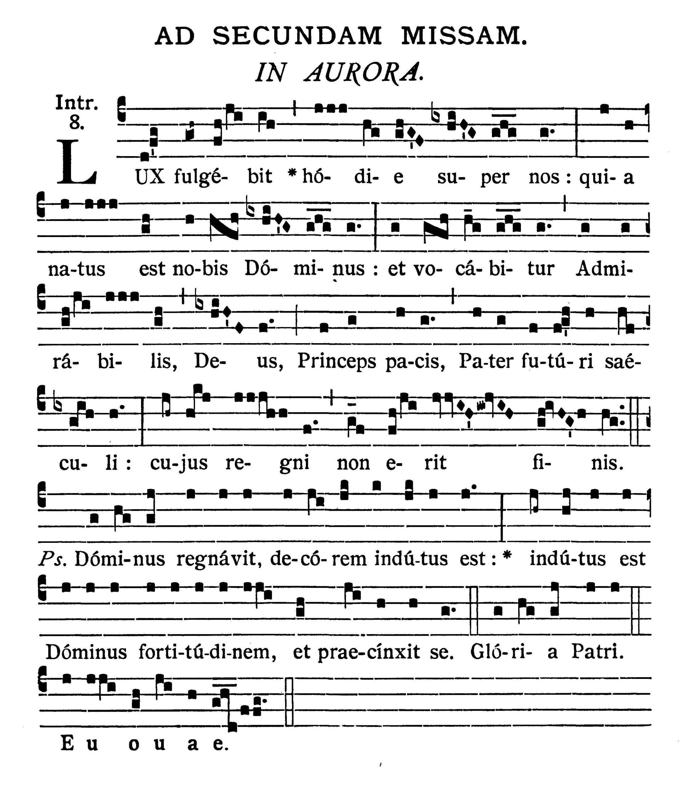 Iz 9, 1, 5 ; Luk 1, 33 Lux fulgébit hódie super nos: quia natus est nobis Dóminus: et vocábitur Admirábilis, Deus, Princeps pacis, Pater futúri sǽculi: cuius regni non erit finis. Salm 92, 1 Dominus regnávit, decorem indutus est: indutus est Dominus fortitudinem, et præcínxit se.