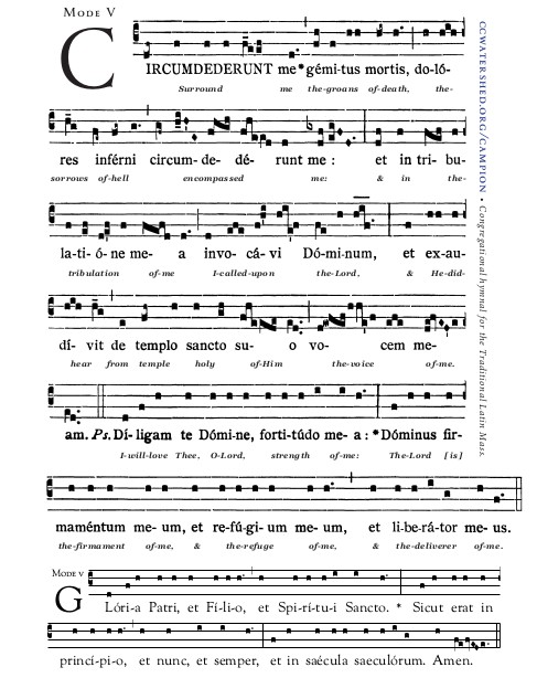 Circumdedérut me gémitus mortis, dolóres inférni circumdedérunt me : et in tribulatióne mea invocávi Dóminum, et exaudívit de templo sancto suo voce meam.+ 2-3 / Díligam te, Dómine, fortitúdo mea: Dóminus firmaméntum meum, et refúgium meum, et liberátor meus.